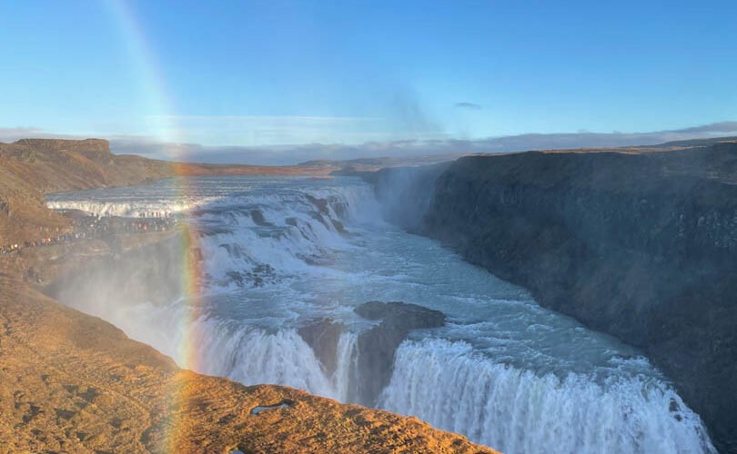 Gullfoss, often called the “Golden Falls,” is one of Iceland’s most iconic natural wonders. This majestic waterfall tumbles in two tiers down a rugged canyon, creating a breathtaking spectacle as the Hvítá River plunges into a misty abyss. With a constant roar and rainbows often gracing its spray, Gullfoss exemplifies the untamed beauty of Iceland’s landscapes. Its accessibility from the Golden Circle route makes it a must-see attraction for visitors exploring the country’s unique geological wonders.